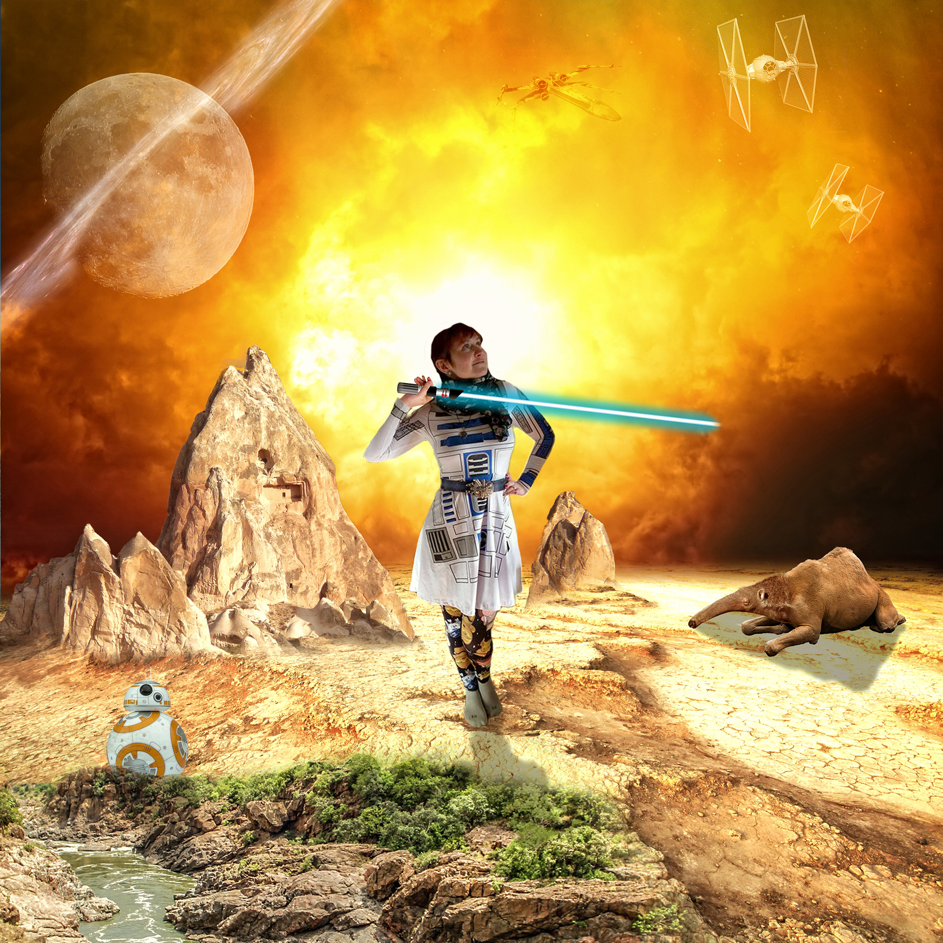 Composite made from multiple photos, filters, blending modes, and adjustment layers. This one is special, because I made it for a friend (in the artwork). She has since died of cancer.